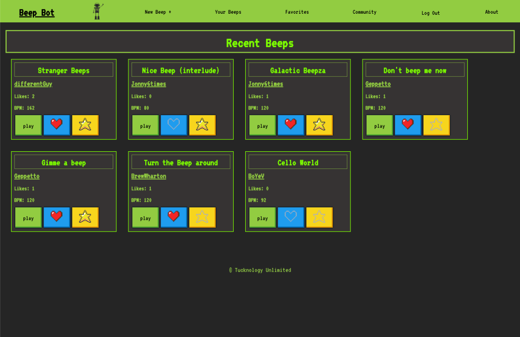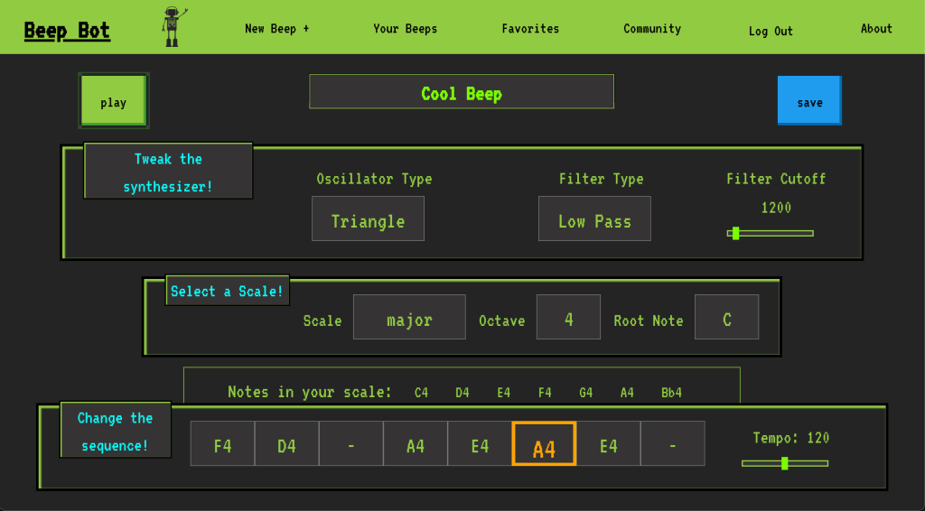 Beep Bot is a musical creation/education tool with a social media element. Users can create a simple synthesizer sequence and view/favorite sequences from other users. Beep Bot utilizes tone.js for sound generation/manipulation, and tonal.js for a scale select feature, providing the user with a scale of notes based on the root note, octave, and scale name. This project was made via react, node, pgsql, passport for login, and good old CSS